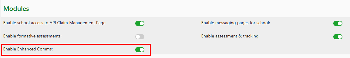 GO 4 Schools MIS Communications includes the option to set up templates for email, text messages and mobile notifications that are used as standard responses for schools. The templates are set up by area i.e. Attendance, Behaviour etc, and per recipient: parents, students and staff. To use templates the school must have the MIS and Enhanced Comms module enabled in Settings > Contact details and settings > General tab > Modules: