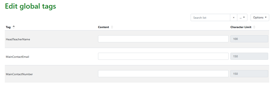 Go to People > Settings > Email settings > Global tags to access the page to add values for the tags used in the MIS. This includes: