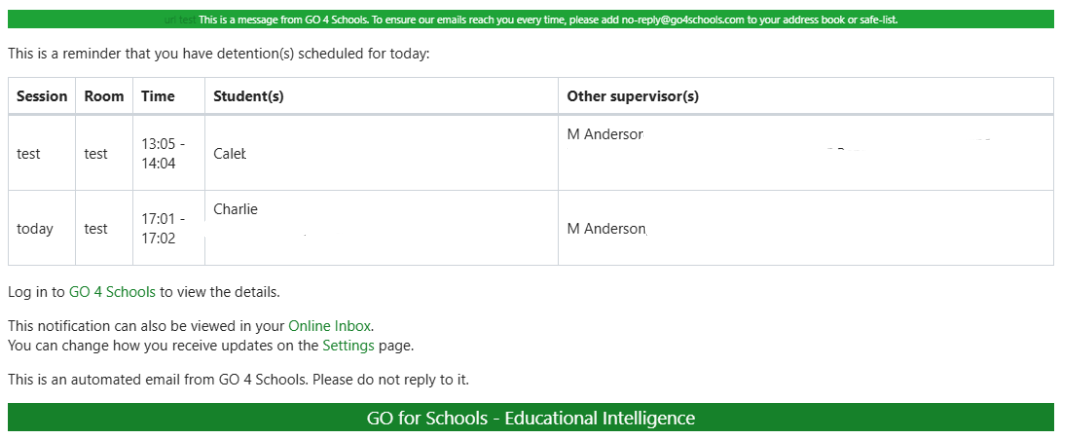 - Lists every upcoming detention session on the day and from the time that the notifications were sent for the email's recipient.