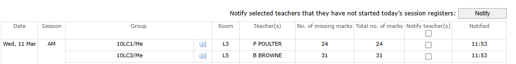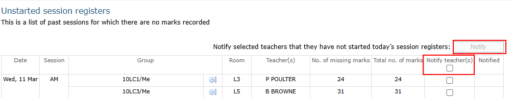 The lists include unstarted registers and incomplete registers. Each list now includes an option to select staff to notify that the registers are not complete.