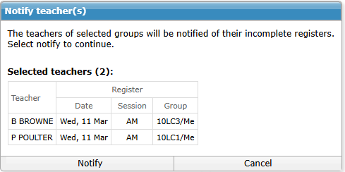 Once selected a pop-up will confirm the staff who will be notified that the register needs completing: