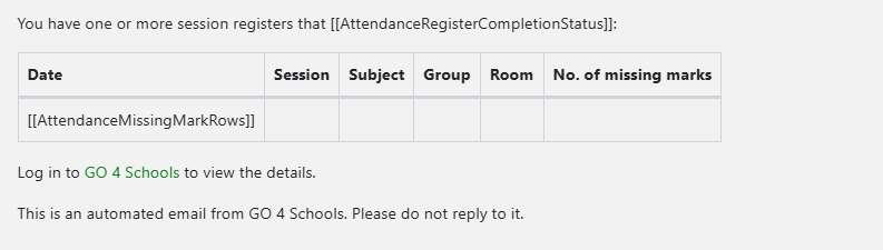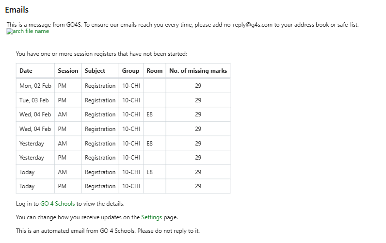 If the teacher has multiple incomplete registers the email will display as below, messages to staff will include school specific footers and details: